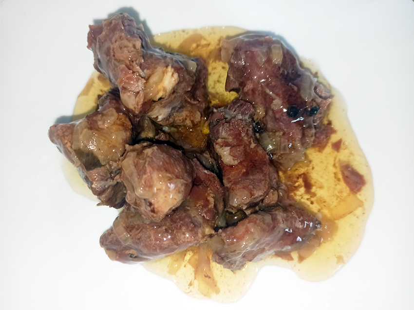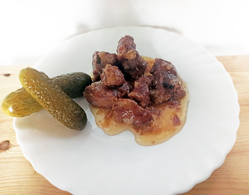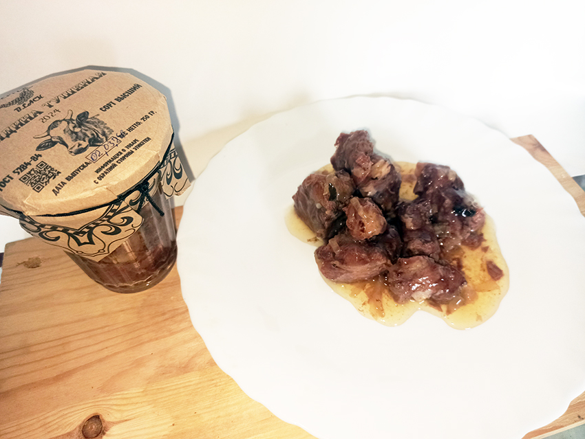 Состав: Говядина (подбедерок), жир-сырец говяжий, лук репчатый (свежий), соль поваренная, перец черный (горошек), лист лавровый.
